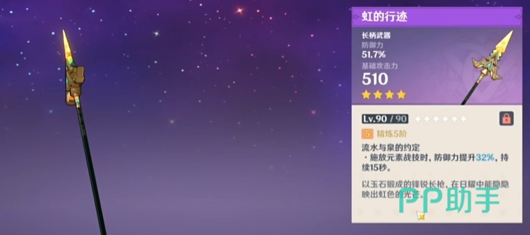 虹的行迹,90级主词条可以加51.7%的超高防御,特效使用战技加防御,目前游戏里缺少输出向的防御力长枪角色,新4星“卡齐娜”和老4星“云堇”算是比较合适的,云堇可以充能加双方词条的部位,然后武器用这个带防御的。