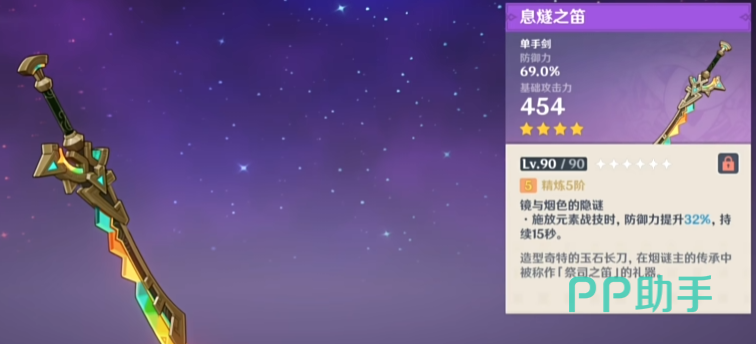 息燧之笛,69%的防御力主词条,特效是在战技使用后可以获得32%的防御加成,持续15秒。单手剑角色中可以吃到防御加成的有阿贝多、千织,但都不是这两位的最优选择。