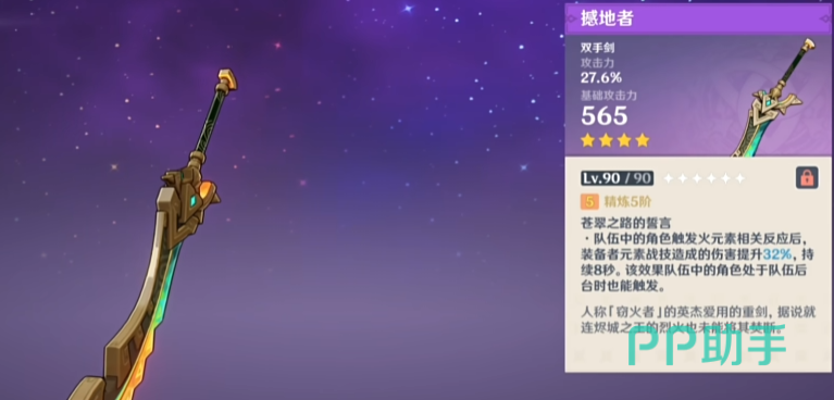 撼地者,很强,有565的攻击白值,外加27.6%的攻击力加成,特效在队友触发火元素相关反应后提升装备者32%的战技伤害,持续8秒,即便是在后台也能触发,也就是主C副C都能用。比较推荐给娜维娅(绑定香菱)主打战技伤害。