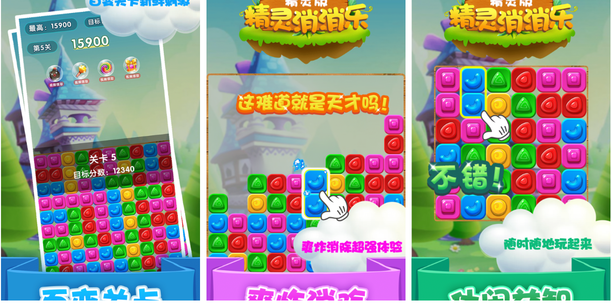 这款精灵版本的消消乐游戏具有永不过时的点触式消除玩法,随着关卡推进消除的难度也会不断上升,休闲愉快的游戏氛围+精妙的关卡设计让大家欲罢不能,更有一系列超级实用的小道具助力玩家轻松闯关,有趣的声音效果与可爱的界面也给大家耳目一新之感,屏幕前各位消消乐游戏粉丝不可错过这款灵动的消除神作。