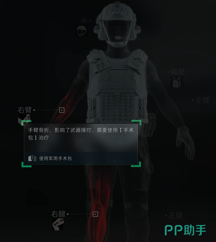 而双腿和双臂可能出现骨折。手臂骨折会影响稳定控制武器后坐力,而腿部骨折则会大幅降低移动速度。即便这些异常状态没有持续降低健康值,也需要尽快使用手术包修复。