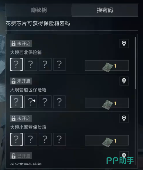 到达指定地点后,寻找上锁的门并使用之前获得的密钥打开它们。打开门后,会随机生成一些芯片,而每个房间通常会有两个芯片刷出。获得芯片后,可以将其放入安全箱里,之后带着芯片安全撤离。当再次回到活动页面并点击“换密码”选项时,你就可以选择想要兑换密码的保险箱,例如大坝西北的保险箱。通过点击左侧电路板图标来使用芯片,注意每次兑换只能获取一位数字的密码,而完整的密码则需要四个芯片。