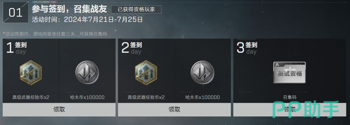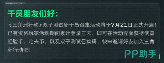 这一次召集活动的具体时间为7月21日至27月25日,是当时的双子测试来的,目前已经过期了,在活动期间,玩家可以通过每日签到来获取各类奖励。首次签到即可获得高级武器经验币和大量的哈夫币,而在连续签到两天后,将会解锁更为珍贵的测试资格——召集码。这份召集码不仅能够用于分享测试资格,还能引导你的朋友一同进入三角洲行动的世界。