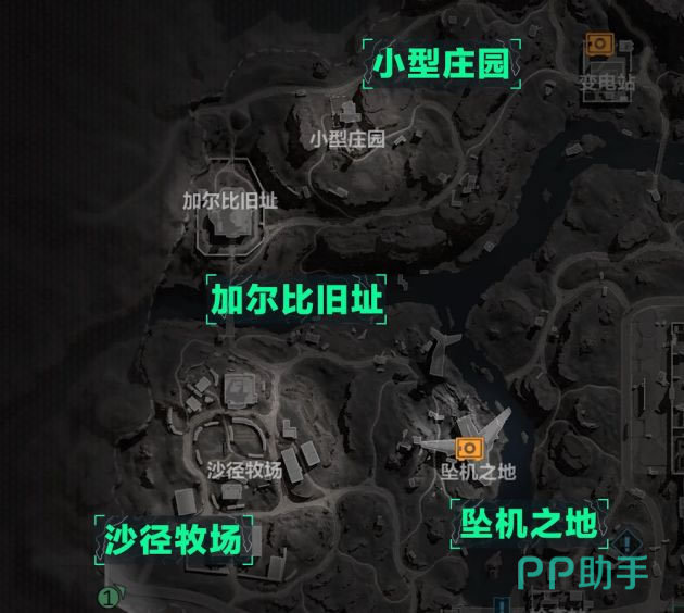 在溪谷的左侧位置,从上到下分别是小型庄园、加尔比旧址,最下面左侧是沙径牧场,右侧是坠机之地。在小型庄园中很难找到什么有用的物资补给,而加尔比旧址则有不少药品医疗道具,如果不赶时间,可以稍加搜寻获得一些有用的东西。进入沙径牧场可以获得一些材料工具之类的,若是发生了对局,地图就会出现飞机的残骸,未发生时可以进入临近的小渔港获得一些物资补给。