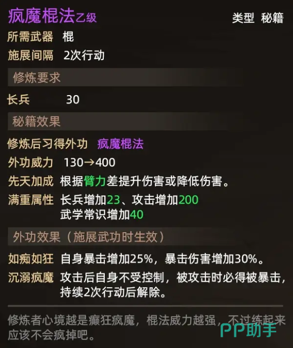 疯魔棍法是紫色品质的武功秘笈,施展的间隔CD为两次行动,它能够增加基础的攻击倍率,以及增加长兵器的基础属性,如果玩家想要修炼疯魔棍法,对于长兵器的属性要达到三十点以上,它能够增加玩家自身暴击率25%,并且增加暴击伤害30%,是游戏中期能够获得的比较好的棍法,想要获得疯魔棍法则必须要完成恶乞丐的入队,当玩家的剧情内容推进到为富不仁时,则可以结识到恶乞丐这个NPC,玩家和恶乞丐对话即可获得恶乞丐的相关任务。