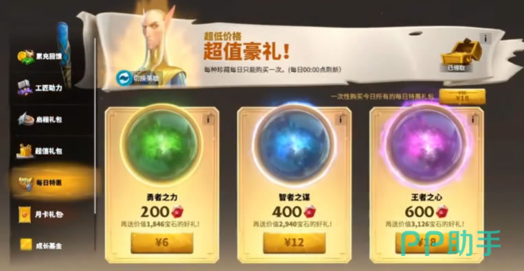 每日特惠也是一个相当具有价值的购买内容,每天18元的付费,可以一次性拿到大量超值资源,对于实力提升很有帮助。