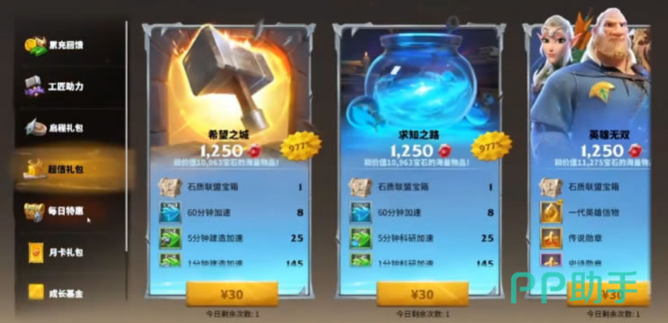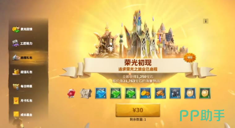 游戏中有很多弹出礼包,它的性价比是非常高的。弹出礼包一般是最具价值的,不仅有着大量的稀有道具资源内容,还含有不少红宝石,红宝石之后能够用于购买VIP等级积分。弹出礼包随着玩家的升级和功能开启会不断激活,但它是一个限时购买的项目,一般在1小时如果没有购买就会消失。