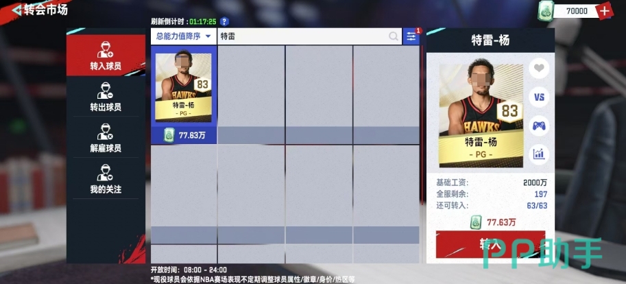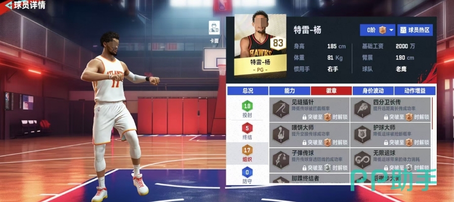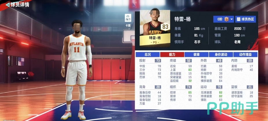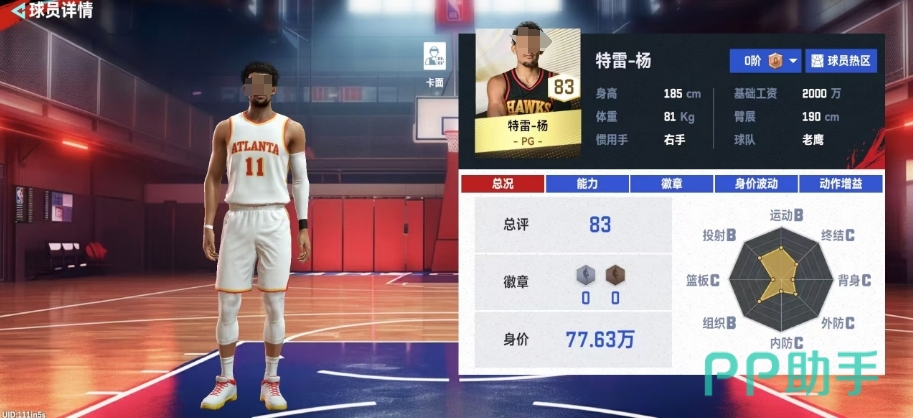 身高189让特雷-杨在篮球场上的位置可能偏向于后卫,这样的身高并不算特别突出,尤其是在专业篮球运动员中,不过他190cm的臂展在篮球运动中是一个重要的指标,它有助于他在防守时更有效地封盖对手的投篮和传球,其实这些身体条件的数据也向大家解释了为什么他的身价相对较低,一般情况都是在77.63万左右,对于游戏初期的玩家而言,他是一个相对容易获取的球员。