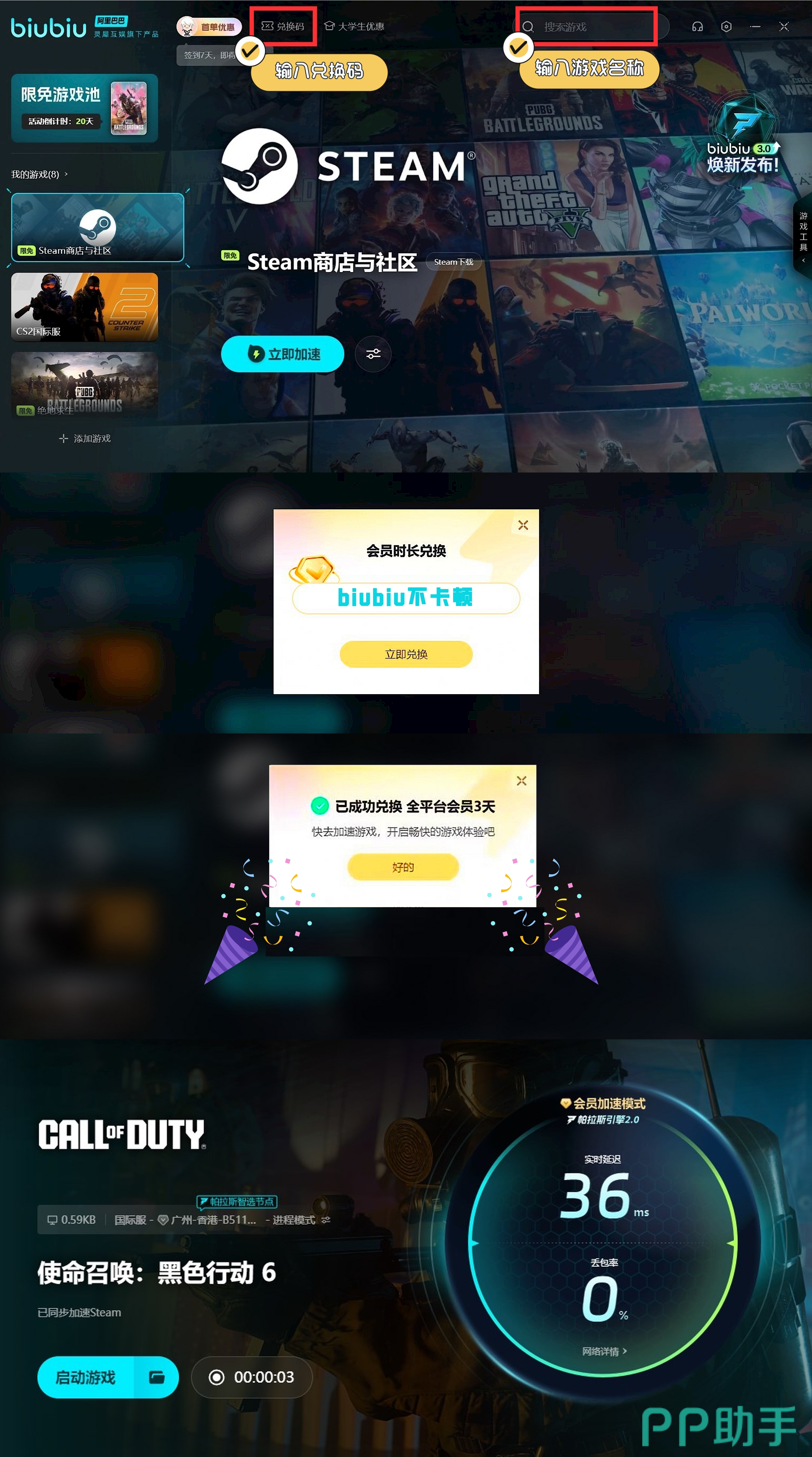 它也是熟面孔了,可以为这类网速要求极高的射击游戏提供电竞级的加速体验。目前新用户注册下载biubiu可以免费获得24H的加速时长,体验时长用完后再输入“biubiu不卡顿”就可以获得3天会员,值得一提的是兑换码对新老用户都有效哦!