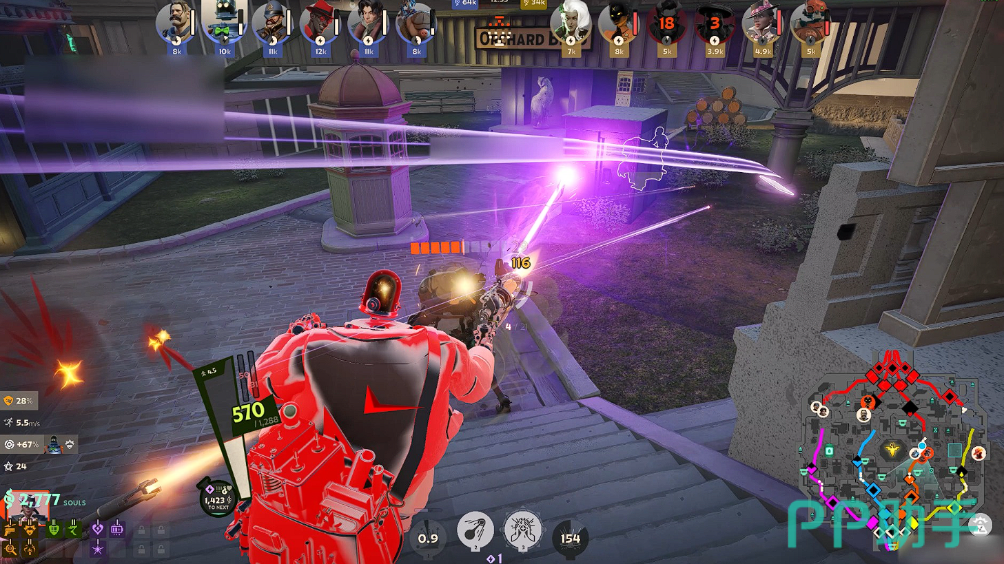 游戏目前已有19个英雄供玩家选择,包括魔术师、机器人、奇特生物和人类等,每个英雄都有独特的定位和玩法风格,如远程输出、治疗、坦克和刺客等。玩家可以通过击败敌人和小兵来获取货币“灵魂”,用于购买物品来增强英雄的能力。游戏地图设计参考了上世纪20年代的纽约,为玩家提供了一个独特而丰富的战斗环境。地图上有可击杀的中立生物和可破坏的箱子,玩家可以从中获取随机地图道具,如减少冷却、回血、弹夹等效果的物品。