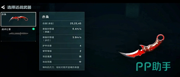 赤枭作为一款近战攻击武器,不少玩家会直接查看它的伤害以及装备的时速,赤枭的多段伤害可以直接达到六位数,并且装备时的移速可以达到每米6.4秒,就在所有的近战攻击武器中都是非常厉害的存在。与一般的一段25和一段34的战术匕首相比,他是两段25再加上最后一段的45,所以不少玩家更倾向于赤枭,再加之它的攻击范围在所有的武器里面处于中等,所以玩家的意愿度会更高。