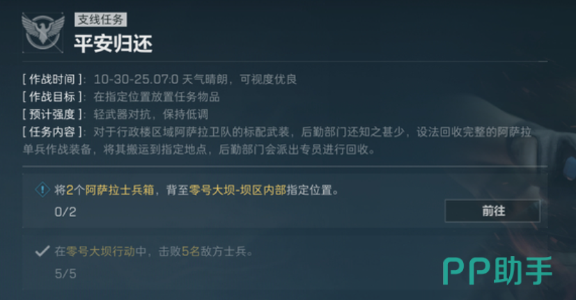 平安归还任务是游戏内的支线任务,它要求在规定时间内完成指定救援任务,本次作战会在晴朗和空旷的区域开展,整体可视性优良,建议玩家搭乘轻武器进行对抗,也可以使用消音器,当然对于狙击能力比较自信的玩家,还可以动用高倍镜进行狙击,为自己扫清障碍,在抵达了行政楼区域时,玩家要和阿萨拉卫队展开战斗,此时玩家需要率先击败五名敌方士兵,随后抵达零号大坝,在零号大坝之中通过击败阿萨拉士兵来获得相关的箱子。