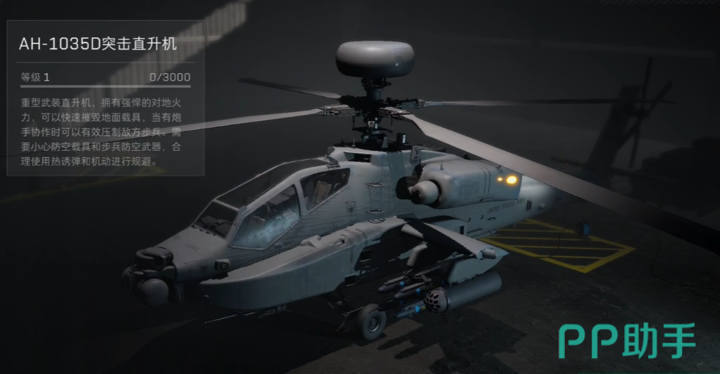 在拥有直升机后各位玩家可以看到等级的部分,当直升机的等级提升之后大家可以根据自己的战斗习惯去更改配置,最开始直升机装配的是反步兵火箭弹,这个火箭弹是专门针对步兵使用的,有着大范围的攻击伤害。