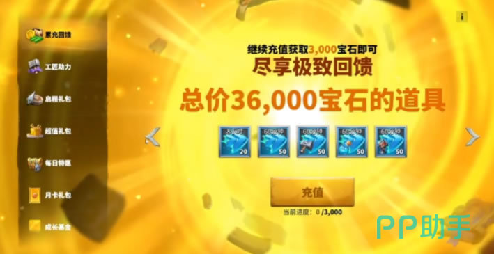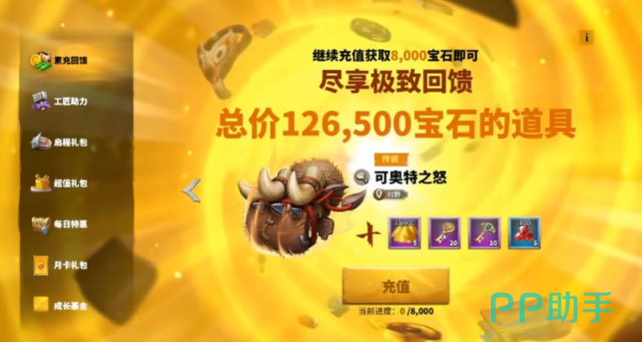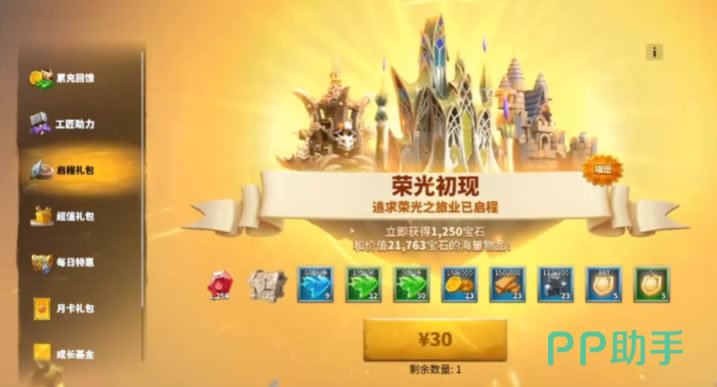 在初期时,另一个值得投资的项目是启程礼包。不仅立刻获得1250的宝石,又可以得到价值高达2万多的资源与道具奖励,不过这个礼包是一次性的助力,只能购买一次哦!