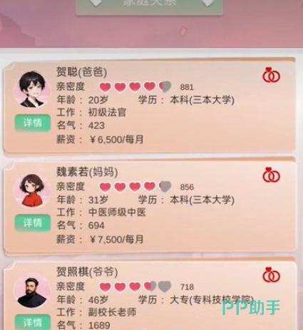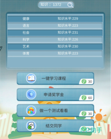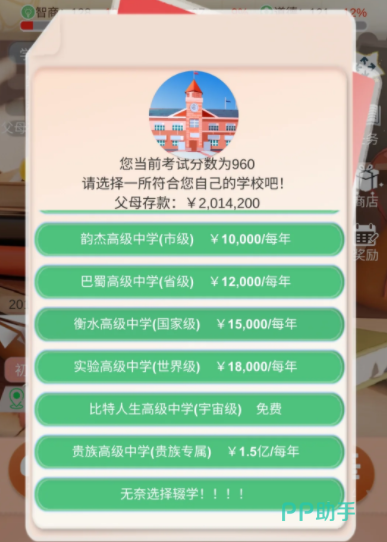 第四题是对于音乐类能力的考察,属于打击乐器的要选择快板,第五题需要回答教室的英文,答案为classroom,第六题是关于礼貌的问题,假如有别人在发言,能做的只有认真倾听,第七题要求玩家选择出成年人正确的体重,选择120~180之间。从幼儿园开始每一年都会有考试,这些考试不会像现实生活中一样区分大量的科目和类别,在游戏里基本上一场考试就已经包含了所有的学科和类目,高考在游戏里也不再是完全改变人生的机会,只要去提升人物的各项天赋以及数值,在毕业之后依旧会有大量的工作可以选择。