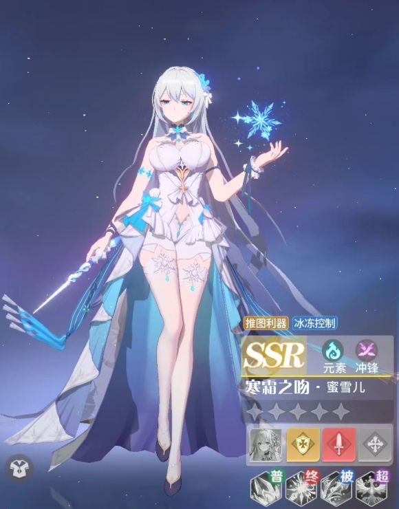 寒霜之吻的本名叫做蜜雪儿,是一个人气很高的角色。也被很多玩家戏称为游戏官方的宠儿,作为一个SSR角色自然有着强大的基础属性。并且是一个输出角色,可以帮助你快速推图,还带有一定的控制能力。