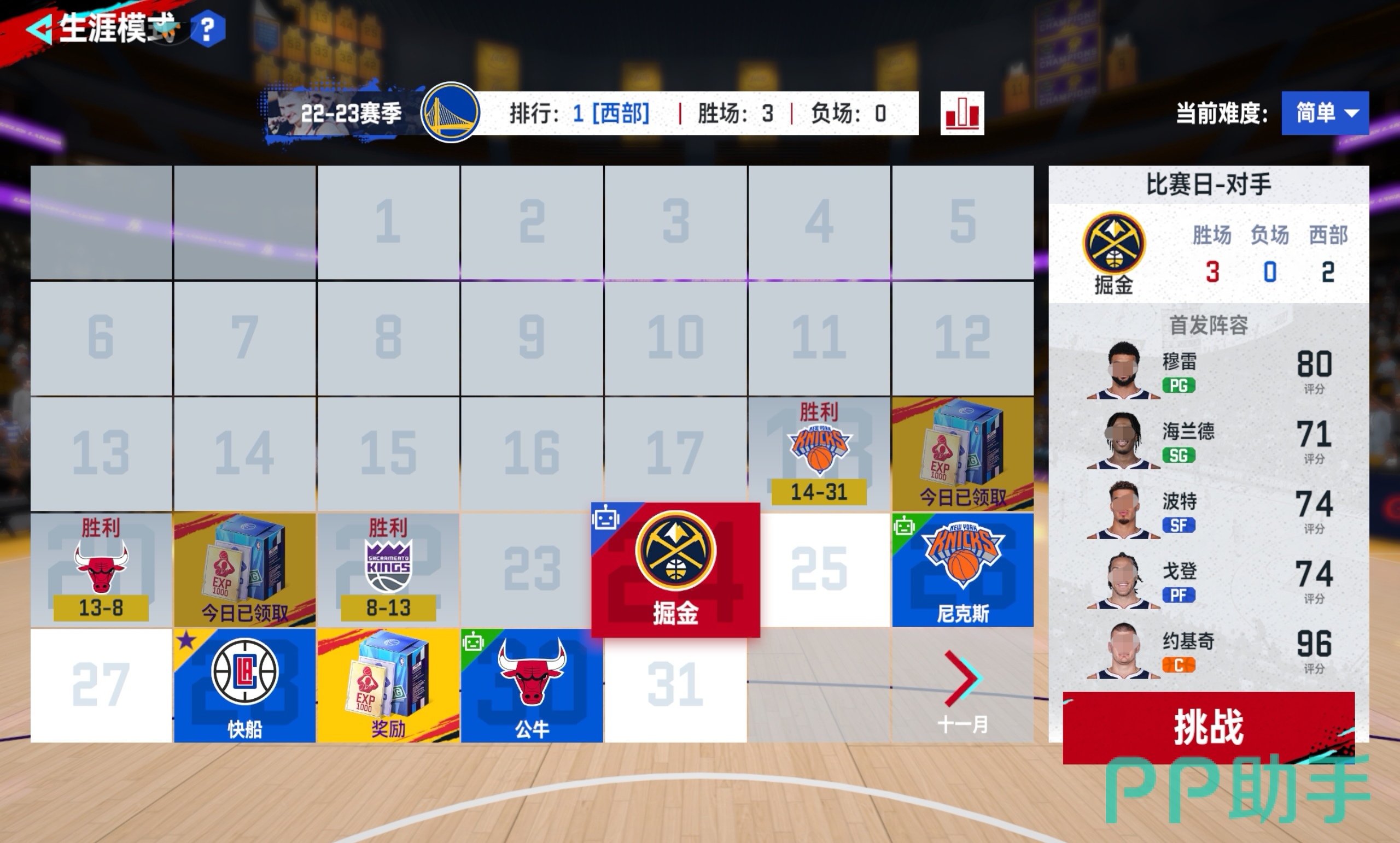 开始游玩这个模式之后,系统会自动生成一个日程表,上面会显示着你将要交手的队伍以及取胜后能拿到的奖励,大家还可以点击上方的排行榜按钮,去查看自己当前所处的位置,与真实的NBA一样,生涯模式也被分为了常规赛和季后赛,不过在进行常规赛时,大家可以选择直接跳过,到了季后赛就必须自己亲手去打了。