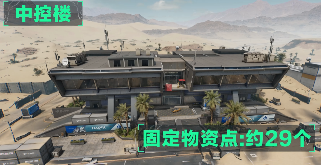 第二个是中控楼,这里一共有29个物资点,二楼里面有一个保险柜是最值得干员去搜索的,这里也是外围地区中物资最多的地方。而且中控楼的视野是最好的,干员们可以在这里获得很多有效的信息。