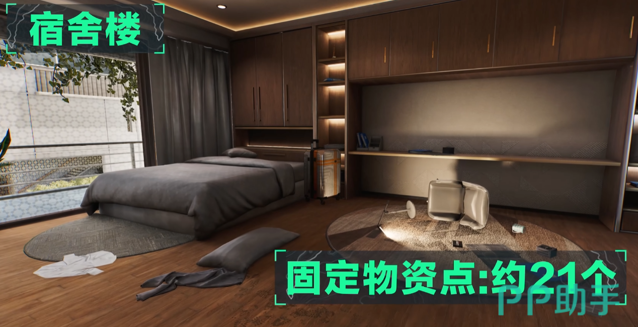 第三个是宿舍楼,这里一共有21个物资点,主要集中在南边的停车场和两层的宿舍里面,在搜集物资时,记得区宿舍的置物架和桌面上看看,会有域外的惊喜发现哦。