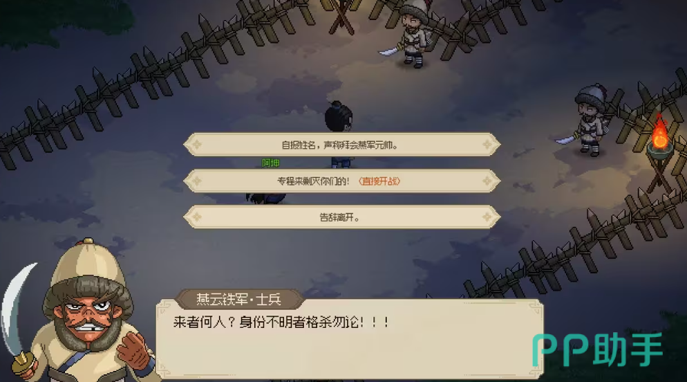 在进入到行辕大营之时,玩家会遭遇到NPC的阻拦,此时会有三个选项,一个是自报姓名,一个是直接开战,一个是告辞离开,这里如果玩家准备充分,则可以直接进行战斗,如果玩家自报姓名,那么会进入到宣和皇帝被杀的剧情内容当中,为了后续剧情正常发展,这里直接和燕军展开战斗即可,整体的战斗难度是比较高的,建议玩家整体的装备水平达到了紫色以上在进行战斗,在完成了所有的战斗之后,玩家将获得铁血丹心的成就,并且将燕云铁军除名。