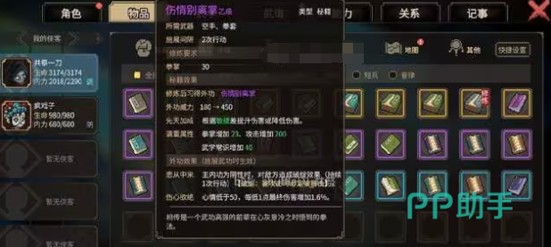 着重介绍的是伤情别离掌,如果大家的角色修炼的是阴性的内功,可以对敌人施加一次破绽效果,同时如果角色的心情低于50点,每降低1点心情就能增加1.6%的最终伤害,对练习野路子功法的朋友们来说非常好用。