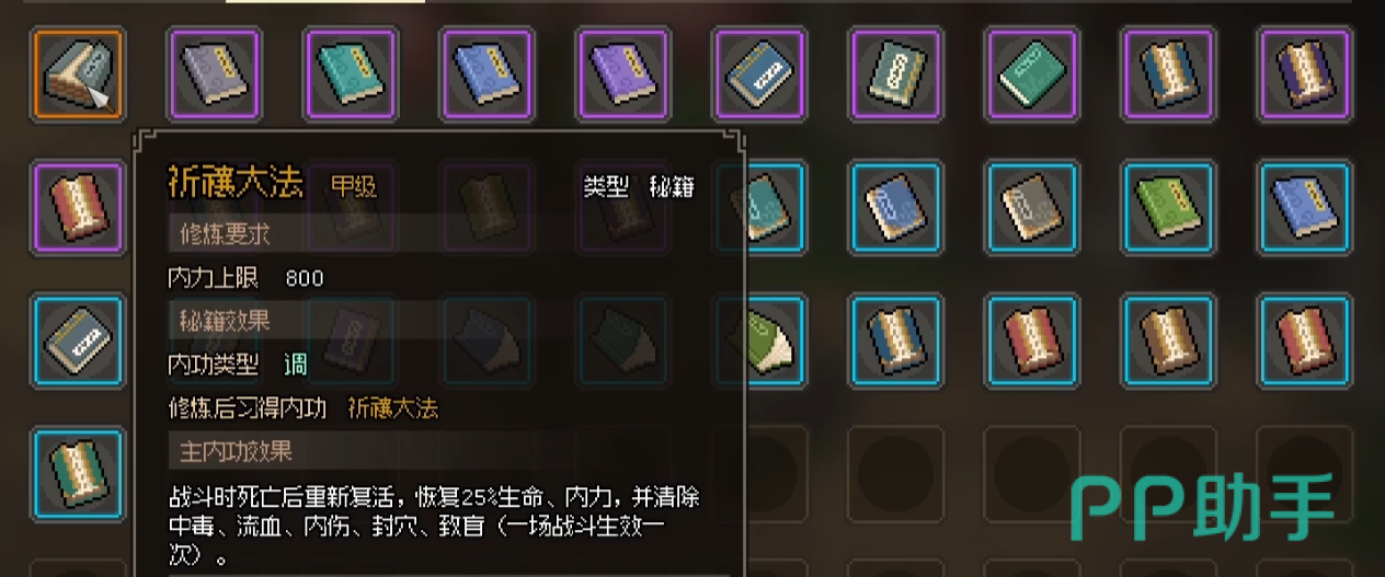 通关以后可以获得一本名叫祈禳大法的秘籍,学会以后在角色死亡后会获得一次复活机会,主角会携带25%的生命值重生并清空一切不良效果,这在后期还是非常给力的一个功法。