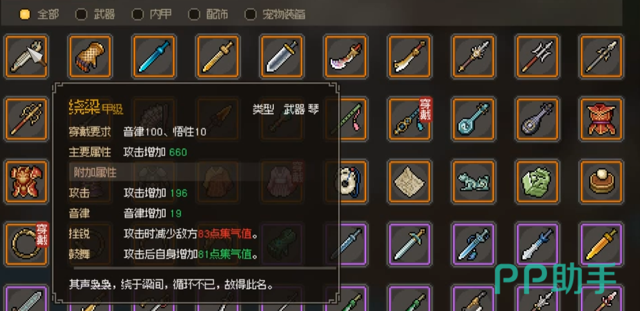 在大侠立志传里面琴是一个非常优雅并且攻击效果非常好的武器,而不同的琴也有不同的品质和效果,绕梁就是一把传说品质的琴,大侠立志传绕梁怎么样就是很多玩琴的朋友们想知道的,下面小编就给大家介绍一下这把武器的具体特性和属性,并附带告诉大家要怎么才能获取到,快来看看吧!