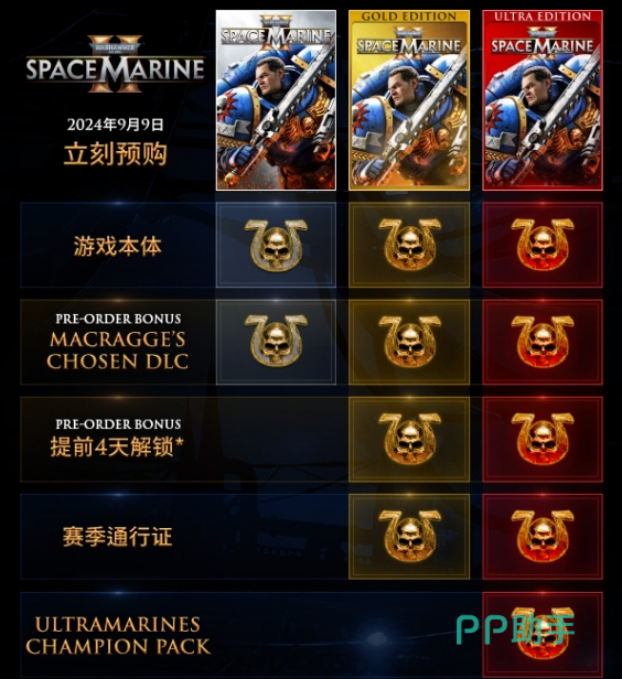 战锤40K星际战士2预购奖励有什么大家现在看到了吧,预购了基础版本虽然有游戏本体以及dlc可玩,但是如果买了终极版本,那获得可就更多了,可以提前4天玩到呢,还有那么多好用的装备可以获取,再加上通行证奖励,大家买下来好处还是很多的。