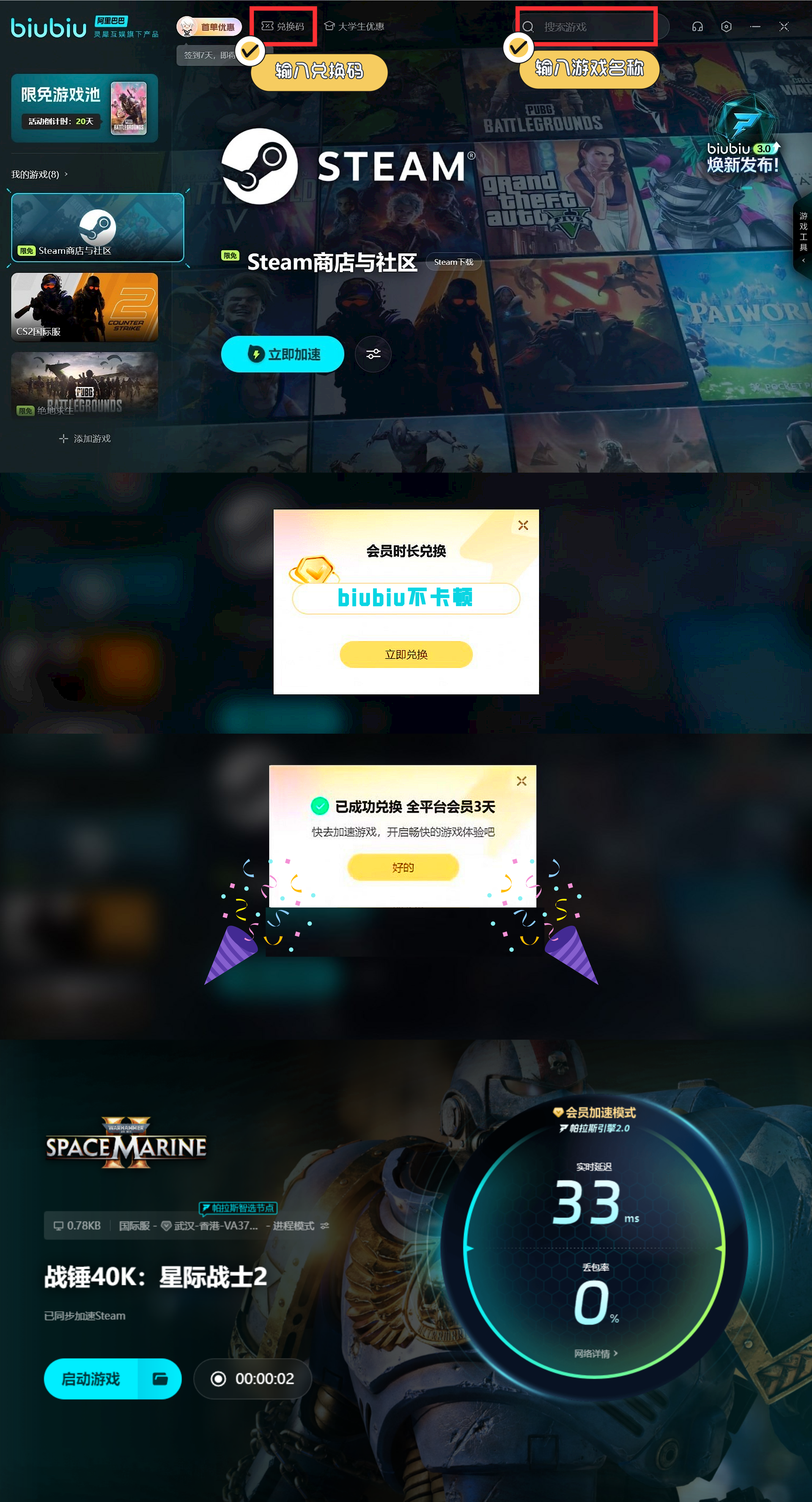 现在biubiu新用户可是直接就得到免费的24小时使用时间哦,还有个兑换码【biubiu不卡顿】可以用,兑换获得额外的72小时加速时间,新人可以用到96小时,而老用户则是可以用兑换的72小时哦。