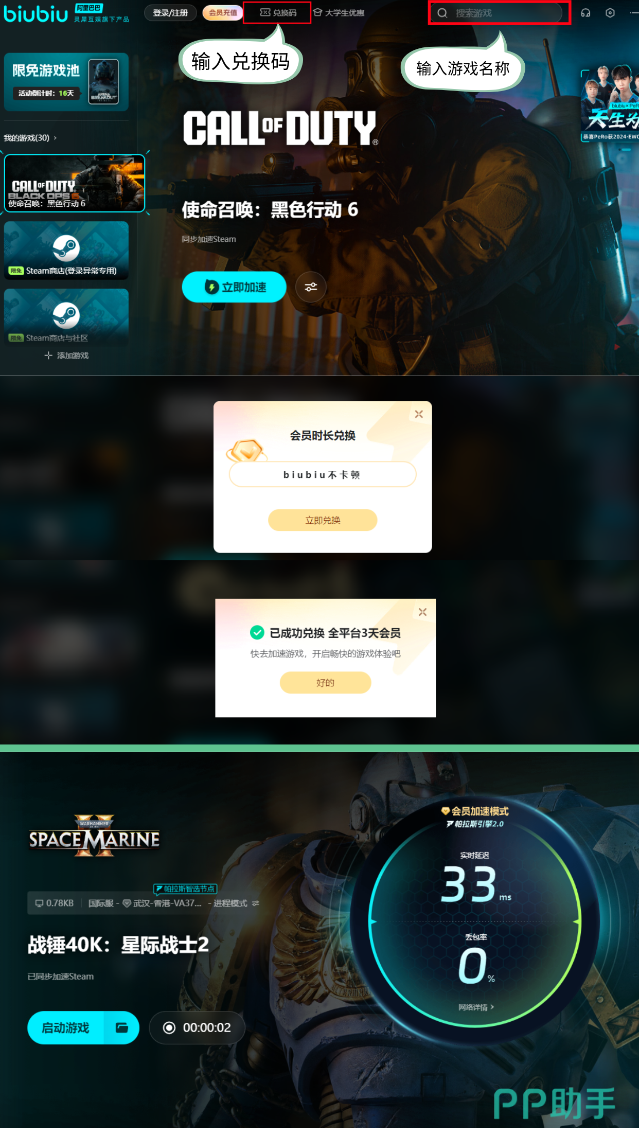 现在有很多新人福利,小伙伴们不需要花1分钱就可以免费加速,比如新人注册有24小时福利,在这期间大家玩任何biubiu里可加速的游戏都是免费的,若是觉得体验时间不够,还可以用兑换码【biubiu不卡顿】再领三天,老用户也可领取。