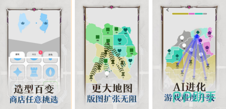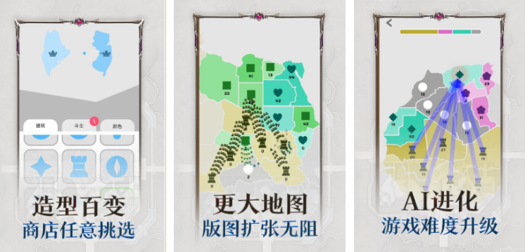 如果想要体验一个能够及时对战的游戏,那么帝国扩张绝对是最好的选择,在这个游戏里主打的是对于兵力的调配和派遣,在刚开始的时候需要操控这些士兵帮助自己产出资源,这样才能有更强的能力,同时也能通过这种方式占领更多的领地,自身有了一定基础之后就可以尝试去游戏里和敌方开战,可以运用各种不同的策略,让整个游戏都能变成自己阵营的颜色。