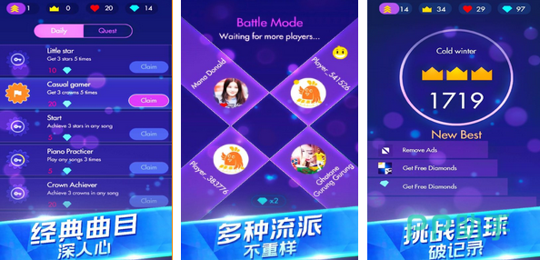 曲目的选择比较经典,玩家可以优先选择比较适合的简单的英文歌曲进行初步体验,任意选择左右手滑动指尖即可。由于曲目代表不同的多种流派,所以玩家可以体验不重样的玩法。挑战记录系统具有实时功能,玩家可随时查看本个曲目弹奏的排名,并且可以重复性挑战直到满意的分数。