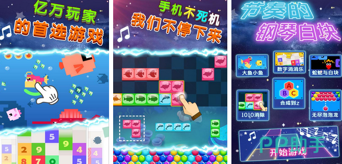 在经典的钢琴白块弹奏环节,玩家需要自己弹奏才能完成绝妙的钢琴曲目的挑战。弹奏的手法简单,玩家根据掉落的白块进行弹奏即可。而在一些拓展性的玩法中,玩家可以遇见字母和数字等多种元素,更有机会参加到大鱼小鱼和数字消消乐等精彩的玩法。