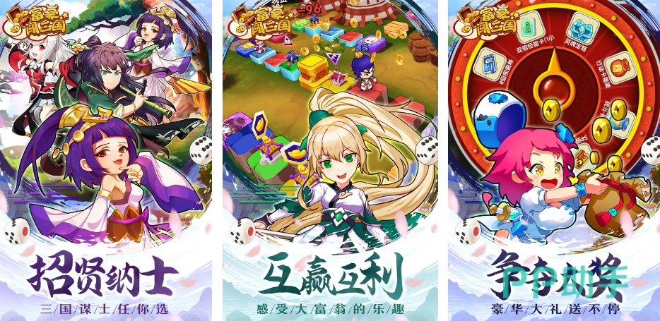 《富豪闯三国》在大富翁玩法的基础的游戏上又添加了三国故事,是一款回合制的策略手游。游戏中大家将置身在三国时期,在棋盘上通过投骰子的方式行动,积累财富。游戏采用的是q版画风,人物造型简单的同时氛围感还特别强。随着卡牌元素的加入,你还可以通过战斗的方式来争夺土地资源,策略性和趣味性都非常强。