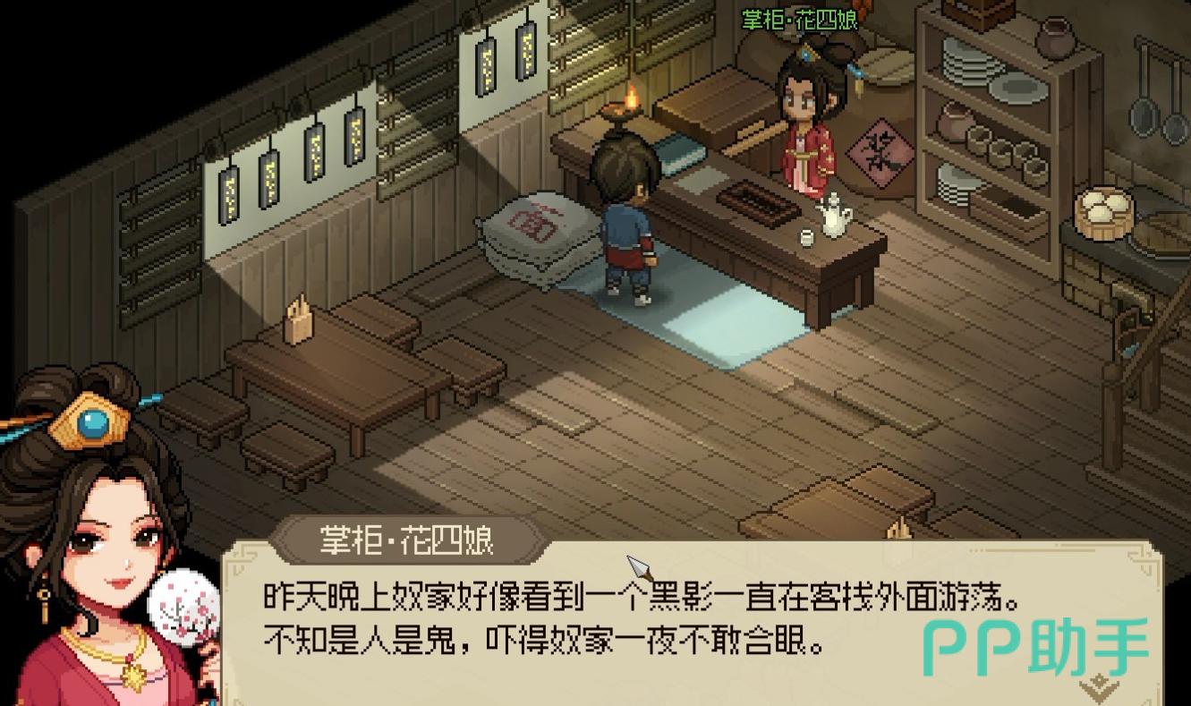 在帮助花四娘并第二次进入客栈后就会触发这段剧情,花四娘会告诉我们,每天在子时到丑时的时间段,都会有几个黑影子在窗外活动,这件事可把她愁怀了,玩家在听到这个消息后,直接选择帮助花四娘。