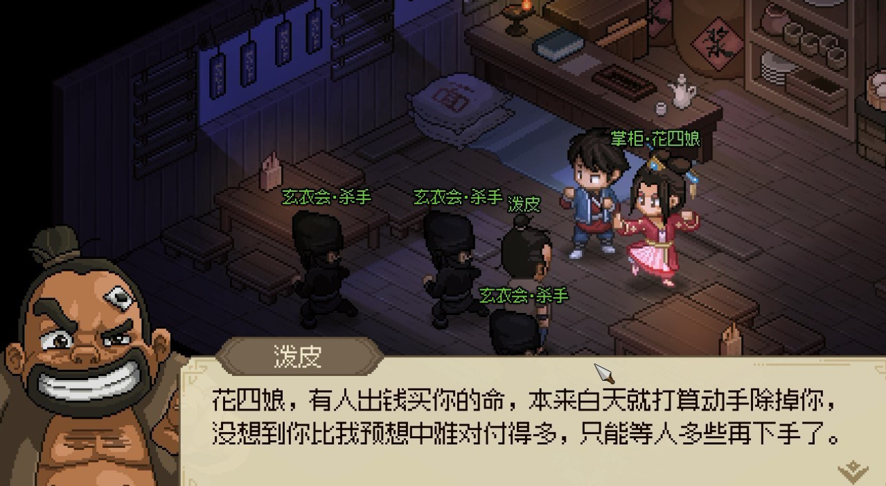 玩家需要先在村子左边的破屋里面睡觉,等到夜晚子时,我们就需要趁着夜色来到花四娘的客栈里,随后就会有数名玄衣会的杀手和前不久想吃霸王餐的流氓闯到客栈中,一番交谈后才得知原来有神秘人想要买花四娘的命。