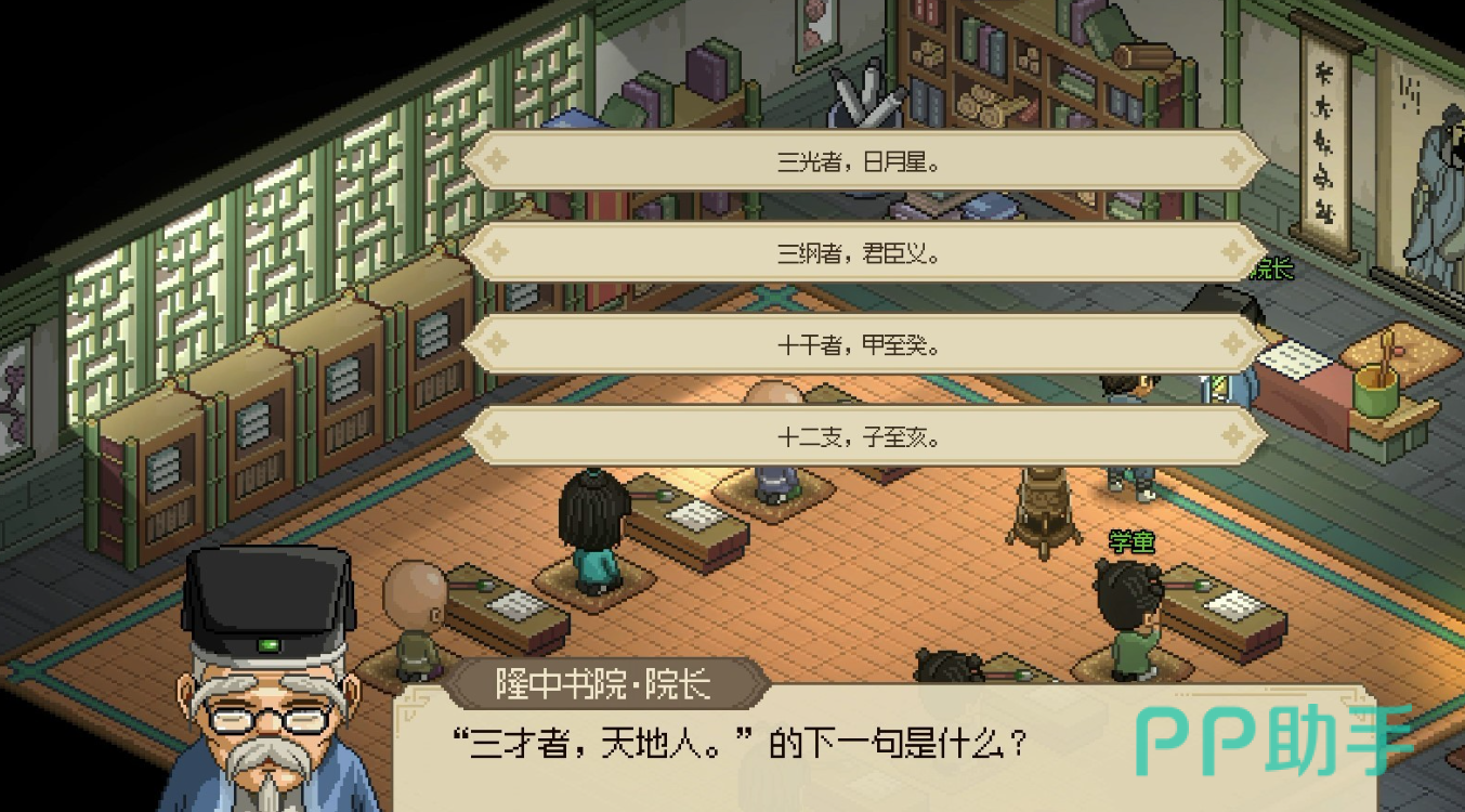 首先玩家需要前往大梁城的隆中书院和院长进行对话,他会让我们回答问题,一共有五题,答案分别是三光者日月星、悌与长易先知、性相近习相远、不积小流无以成江山和圣人不仁以百姓为刍狗。