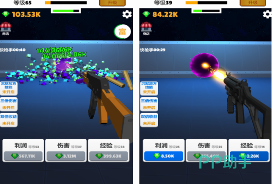 不管是打枪游戏还是射击游戏,都是一种需要拿着枪械进行射击,打枪我贼溜是一款比较休闲有趣的简单小游戏,就连里面的各种枪械都充满着卡通的风格。玩家在拿着游戏当中的枪械以后,可通过单手操控的方式进行射击。每次射击以后都会根据自己的射击水平,获得相应的利润以及经验,甚至是伤害情况。