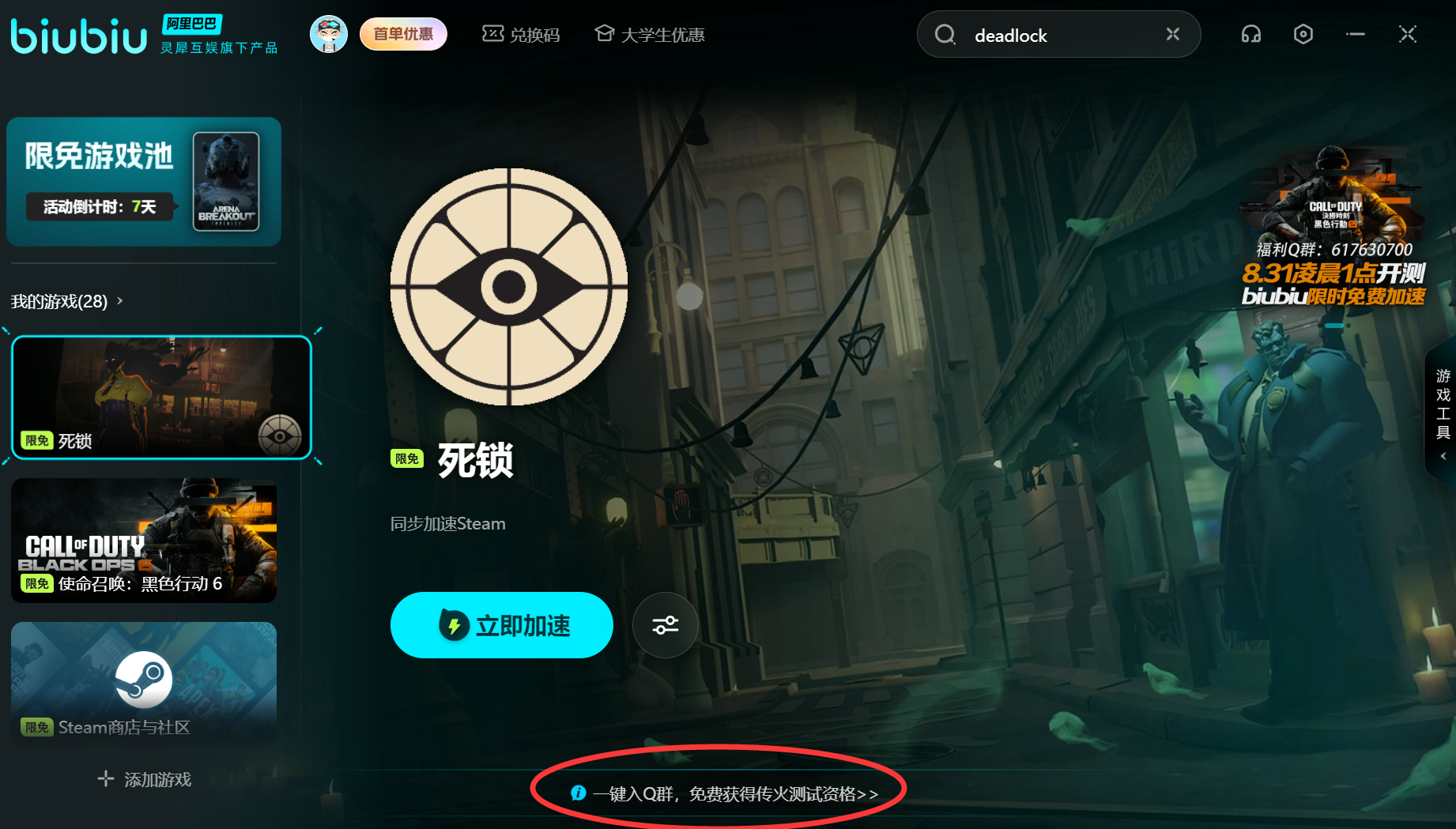 其实游戏的下载方面只能先获取游戏资格之后才能去steam进行下载,而目前获取死锁的游戏资格有两个途径,一个是根据游戏社区的不定时发放,获取非常难。而另一种就是游戏传火,要你的好友拥有测试资格之后传火给你,这样你就可以在steam上进行下载了。而没有测试资格是无法弹出下载功能的哦!但这里还有个前提就是我们steam与传火的steam号都要在曾经使用过5刀以上,才能进行传火,这点只要不是新建账号相信大家都可以满足。当然进入biubiu的死锁专区还有传火q群等你来领!