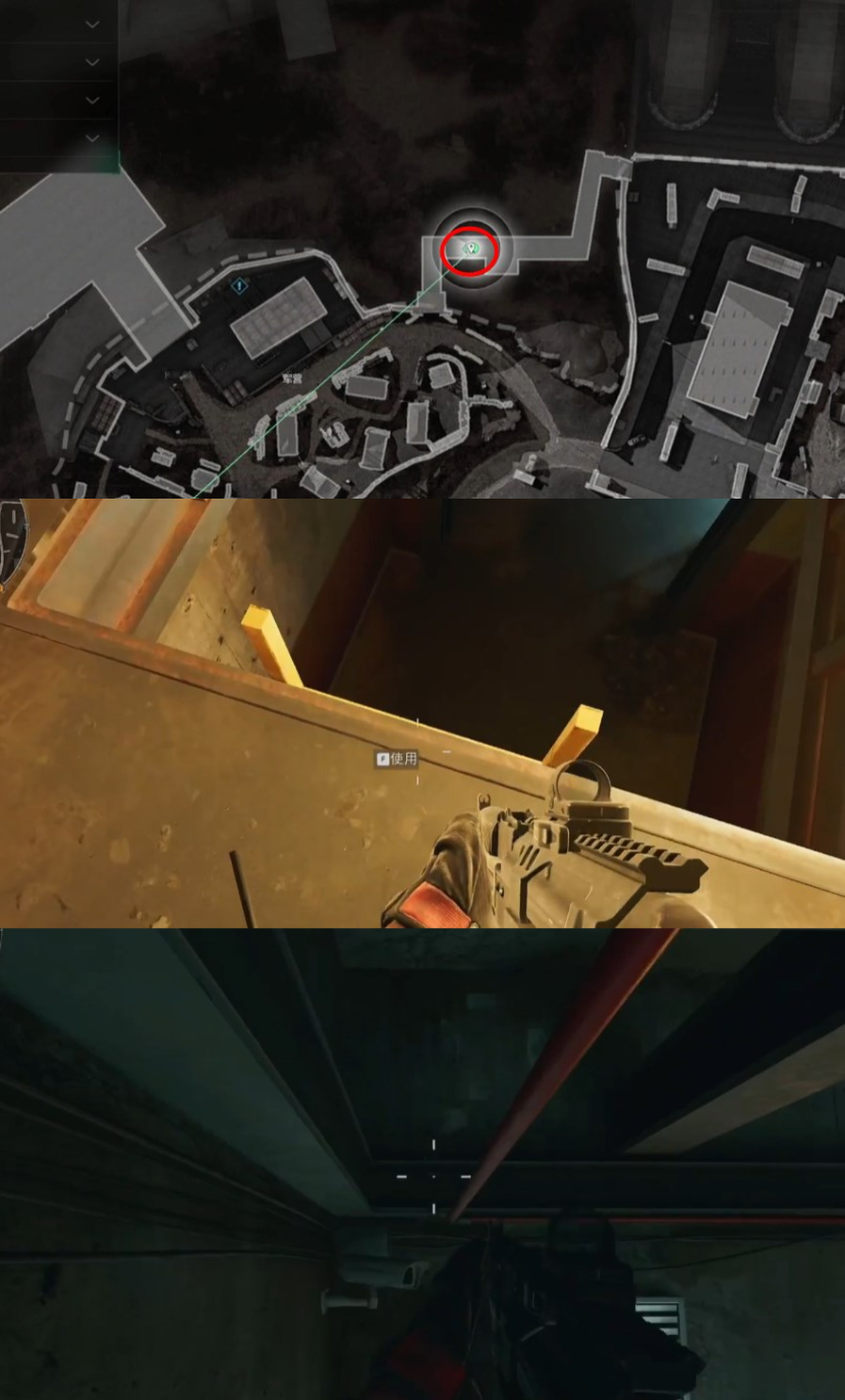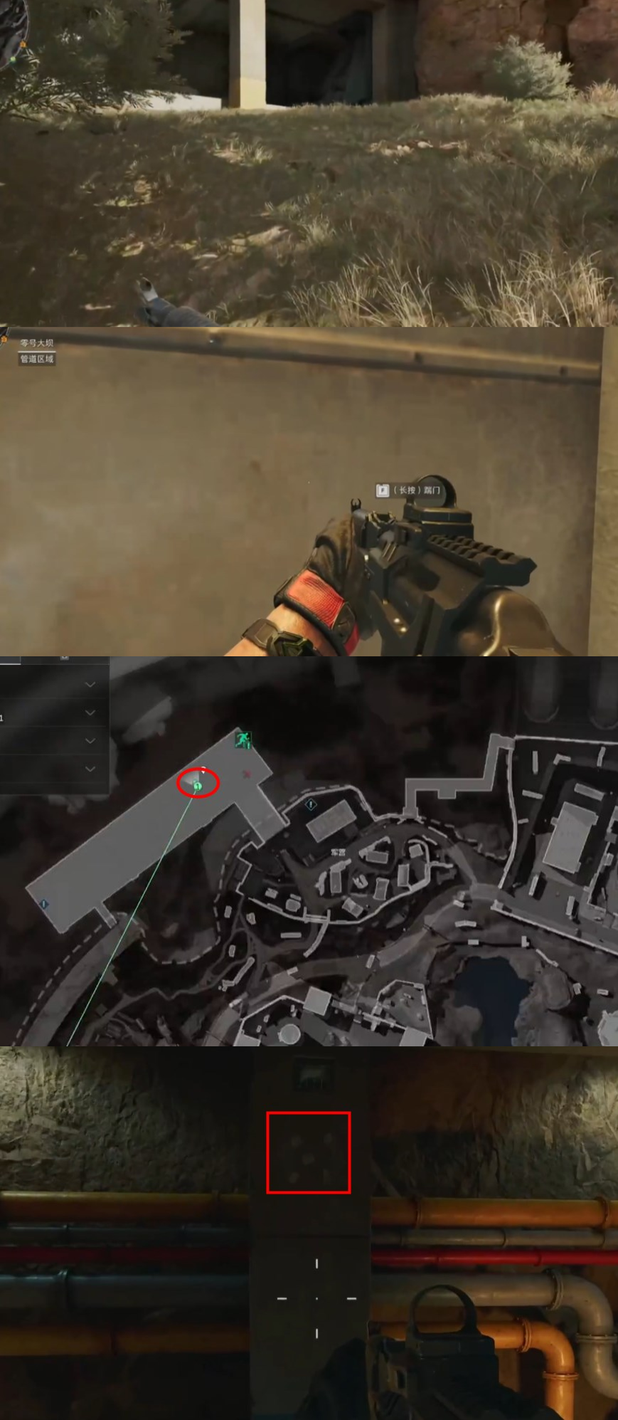 然后从地窖上来,将靠着岩石山体的建筑,将门踢开后,进门右转一直走,来到地图标点如下图所示的位置,在一旁管道的柱子上可以看到第二个密码,左边三个点,右边两条竖线,对应摩斯密码中的数字3。
