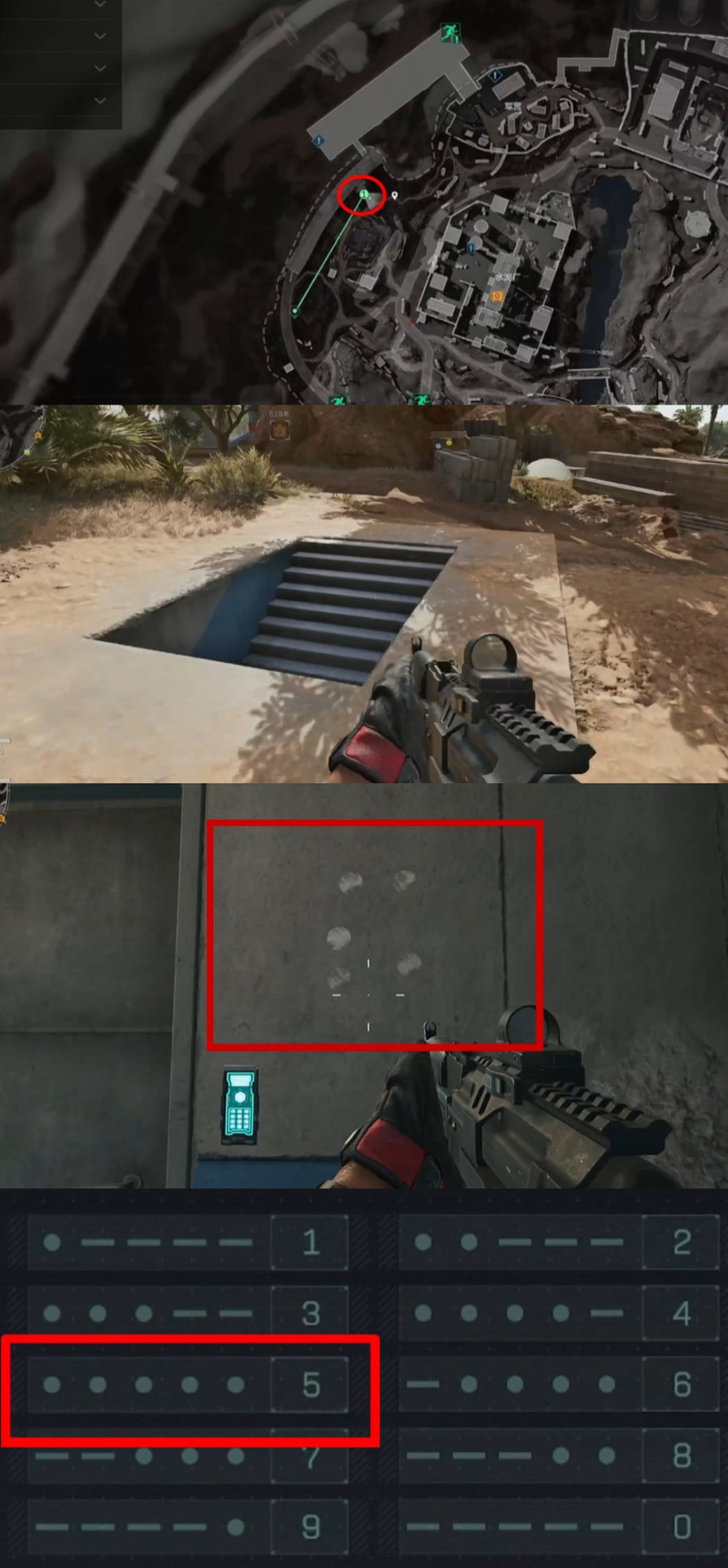 首先来到如图所示的地图标点位置,可以看到有出楼梯通往地窖,在地窖的墙上会有几个白色点,根据摩斯密码对照表了解到这就是5的意思。