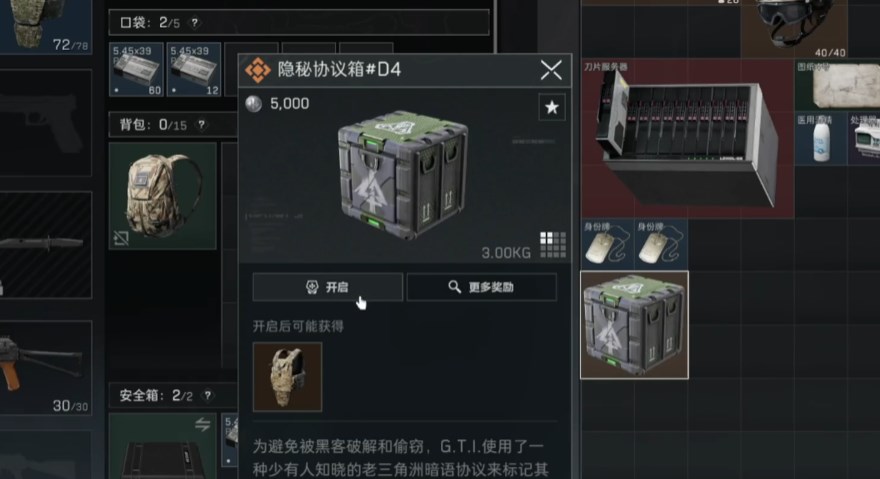 知道前3位对应的是:539,最后一位只需逐个试一试就好。因为每一句游戏内的密码是不一样,所以这里只是告诉大家这些密码的点位,以及对应的方法,大家知道后就可以去开协议箱了。D4协议箱中可以开出5级甲,例如价值接近四十万的FS符合防弹衣。