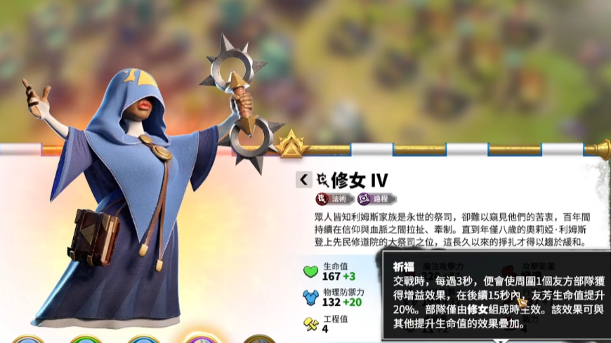 算是最强的史诗级法术英雄了,轻松获取,投资价值大。不仅是零氪玩家可以用,付费玩家也很推荐用。怒气技可以对目标及其范围内的3个部队造成魔法伤害,同时施加沉默效果使其随后2秒内攻击降低最多20%。觉醒后攻击目标则升级为最多4个,debuff持续时间也加了1秒,同时不仅有沉默减攻效果,更是可以降低对方的行军速度。