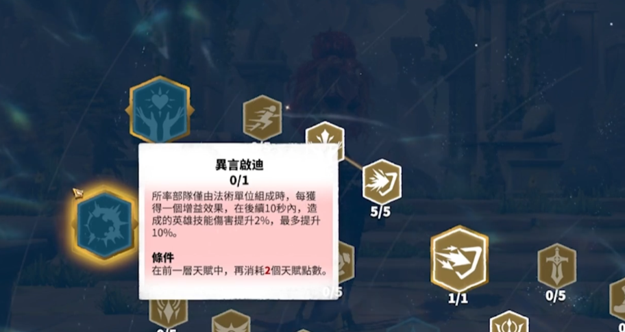 莉莉娅技能基本都是输出向的,为了最大化输出价值,天赋中可以点出副将伤害提升,以及释放技能后追加一次额外伤害,法师是偏向于野战类型的英雄,叠伤害慢不如直伤类的天赋。法术系的天赋中魔力暴风也是建议点出来的,部队只有法术单位的情况下释放怒气技前可以获得无视部分防御的效果,使用莉莉娅自然是玩纯法师队了。