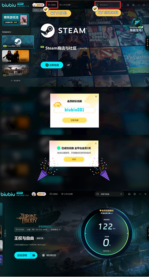 王权与自由游戏对于网络流畅的需求也是相当高的,小编给大家推荐到的这款biubiu加速器能够让大家在游戏中畅玩无阻,不会再有延迟和卡顿的烦恼,大家可以从文中的链接去下载biubiu加速器,然后使用兑换码“biubiu001”,就可以免费领取到三天的加速时长,而且是不管你是新用户还是老用户都可以领取到哦!