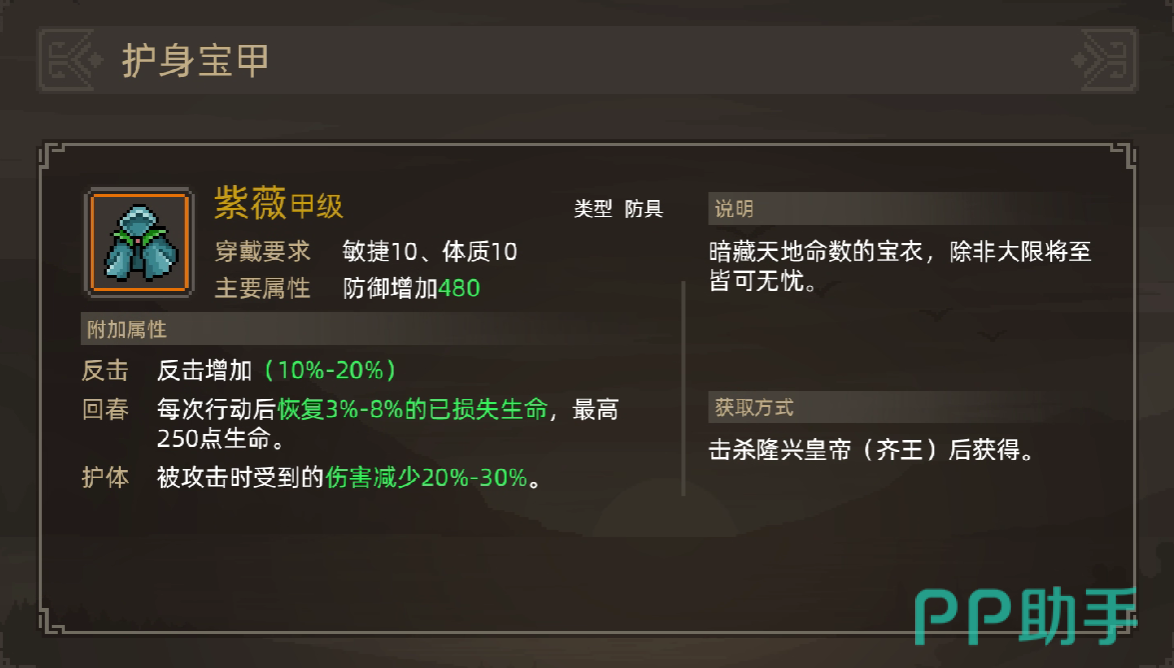 最后还有一些金色防具是要求玩家完成主线任务才能获得的,例如紫薇,他就必须在主线任务当中击杀齐王才能够获得,其反击能力和防御力都是很高的,但是在游戏的中期和后期才能够获得。