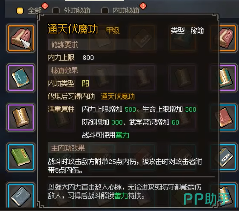通天伏魔功是许多玩家心目中的白月光,这门内功拥有相当全面的属性加成:攻击方面有爆伤加成25%和增伤15%;防御方面有格挡减伤25%以及总体减伤15%。此外还有降低敌方集气速度和闪避加成等特殊属性。然而,通天伏魔功的最大问题在于它缺乏恢复能力,这让它在面对持久战时略显乏力。虽然它提供了不错的减伤和输出能力,但与无极洞等内功相比,在顶难模式下的生存能力稍显不足。