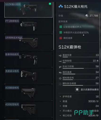 在S12K的改装上,首先要解决的就是稳定性问题。选枪托时,撞火枪托可以说是最好的,因为它能够减少后坐力,避免连续开枪时手指发麻。如果不选撞火枪托,S12K的后坐力会让你在快速连发时感受到相当大的压力,影响命中率。通过撞火枪托,你能够保持持续的火力输出,而不必担心射速过快而导致手感失控。