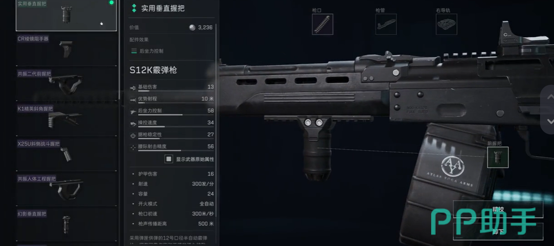 S12K改枪时,握把的选择同样关键。垂直握把在提升稳定性方面表现得非常出色,尤其适合这种连发速度较快的霰弹枪。它能够有效减少枪口上跳,让你在连发时依旧能够保持枪口的稳定,不至于一顿扫射后全都打在天花板上。垂直握把的作用非常明显,能让你在面对敌人时更加沉着自如地应对,保证每发子弹都打到该打的地方。