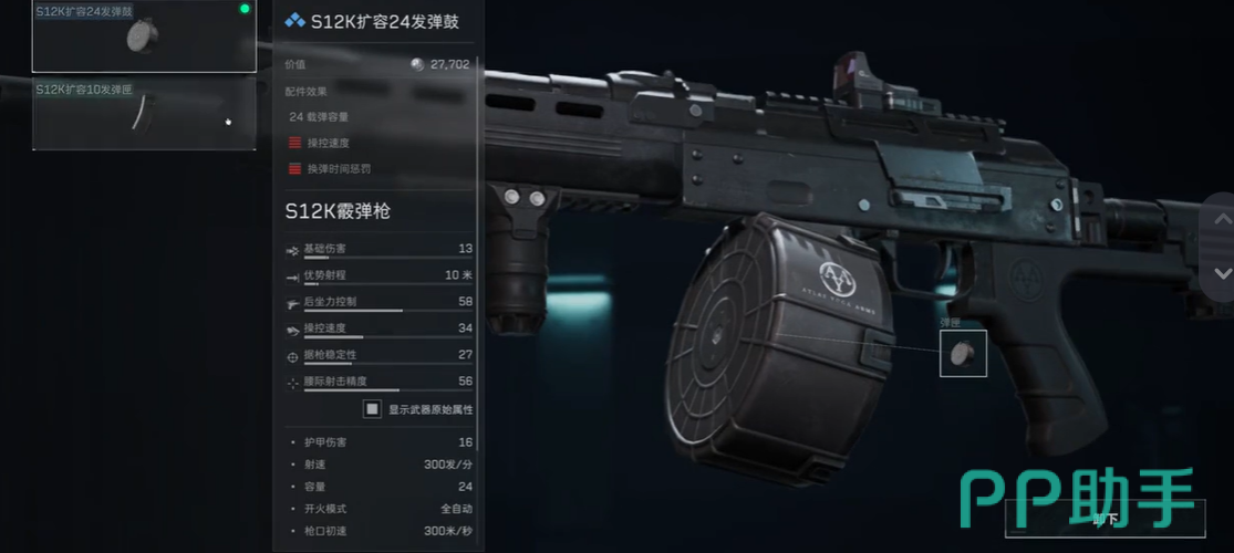 子弹数量对S12K至关重要,这把枪在近战中是火力压制的代表。如果你还在用普通弹匣,那就等着打到一半没子弹吧。改装时一定要选择24发弹鼓,虽然比普通弹匣重了一点,但大大增加了续航能力。在混战中,弹药量的优势是无法忽视的,尤其是在面对很多敌人的时候,子弹数量多些就能让你在换弹时不至于暴露破绽。